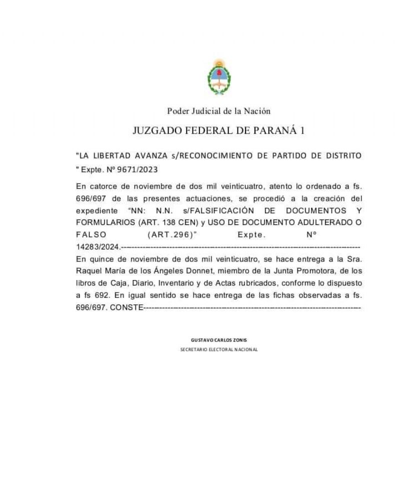 El Secretario Electoral Nacional Gustavo Zoni, del Juzgado Federal Número 1 de Paraná abrió una investigación por "falsificación de documentos y formularios" y "uso de documento adulterado o falso" en la presentación de afiliaciones de LLA en Entre Ríos.